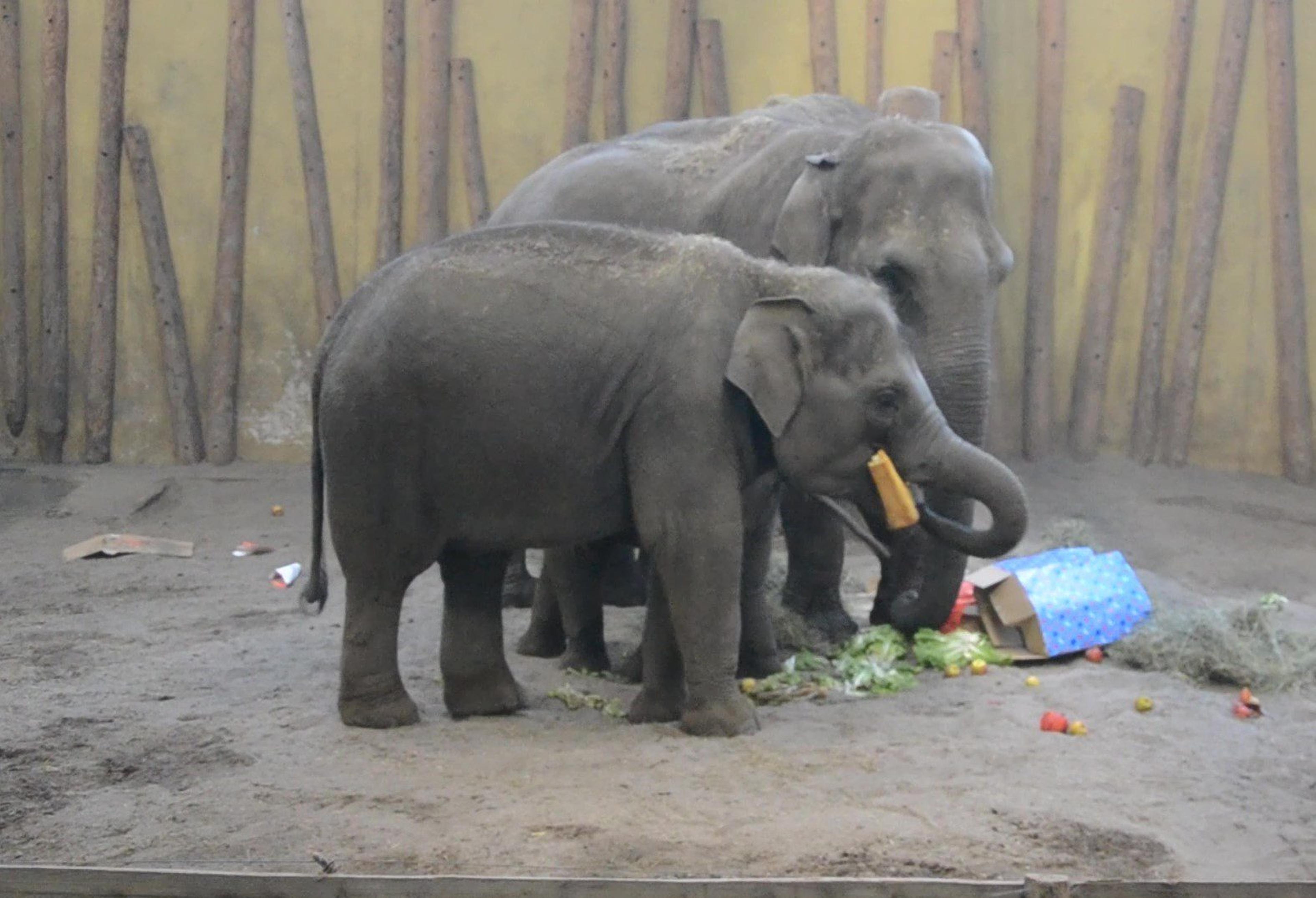 De olifanten werden verrast met cadeautjes, waarin de Sint wat lekkernijen had verstopt.